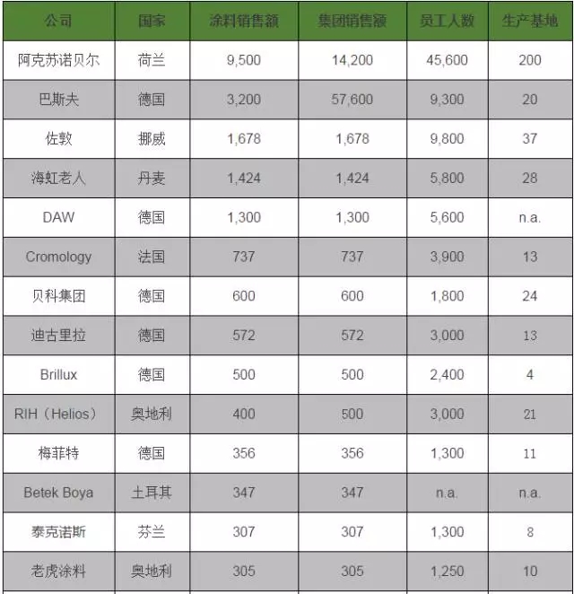 榜单显示,阿克苏诺贝尔(AkzoNobel)仍然是欧洲最大的涂料企业,该公司总部位于荷兰,2016年度涂料业务销售收入为95亿欧元;排名第二位的是总部位于德国的巴斯夫(BASF),2016年度涂料业务销售收入为32亿欧元。