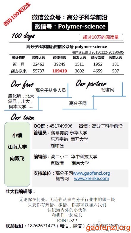 合作伙伴高分子科学前沿100天纪念 高分子网(gaofenzi.org)合作伙伴之高分子科学前沿开通微信公众号开通一百天整,发布百篇优秀文章,获得广大网友喜爱与收藏,订阅数继续攀升,取得优异成绩值得庆祝,望再接再厉,越办越好。 高分子网祝贺! ——————- 附: 高分子网(gaofenzi.org)官方微信订阅号:polymerchemistry,分享新材料、塑料橡胶、工业智造 等原创文章,同样欢迎大家关注与合作。 发布者 高分子 交流高分子材料技术,请搜索关注微信公众号:高分子网,ID:gaofenziorg,获得第一手信息。 查看高分子的所有文章
